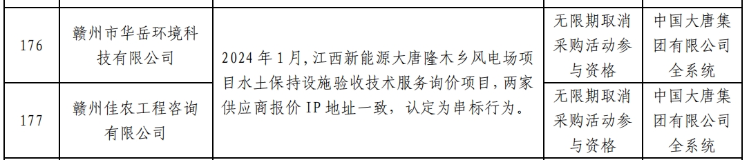 公告显示,2024 年 1 月,江西新能源大唐隆木乡风电场项目水土保持设施验收技术服务询价项目,赣州市华岳环境科技有限公司与赣州佳农工程咨询有限公司报价 IP 地址一致,被认定为串标行为。