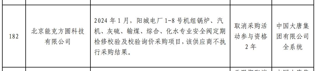 因上述行为,北京能克方圆科技有限公司被中国大唐集团有限公司全系统取消采购活动参与资格2年。