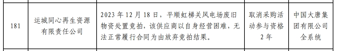 因上述行为,运城同心再生资源有限责任公司被中国大唐集团有限公司全系统取消采购活动参与资格2年。
