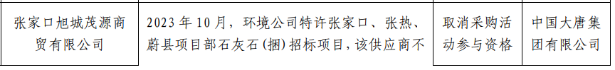 公告显示,2023 年 10 月,环境公司特许张家口、张热、 蔚县项目部石灰石(捆)招标项目,该供应商不执行采购结果。