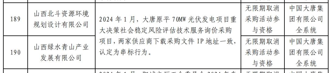 公告显示,2024 年 1 月,大唐原平 70MW 光伏发电项目重大决策社会稳定风险评估技术服务询价采购项目,山西北斗资源环境规划设计有限公司与山西绿水青山产业发展有限公司下载采购文件 IP 地址一致,,被认定为串标行为。
