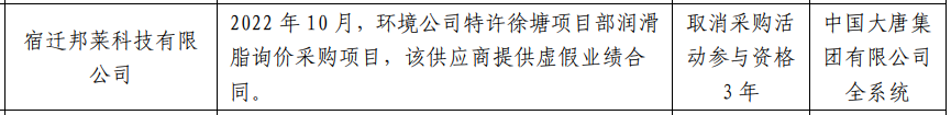 公告显示,2022 年 10 月,环境公司特许徐塘项目部润滑脂询价采购项目,该供应商提供虚假业绩合同。