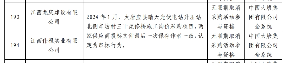 公告显示,2024 年 1 月,大唐应县晴天光伏电站升压站北侧辛坊村三干渠修桥施工询价采购项目,江西龙庆建设有限公司与江西伟程实业有限公司投标文件最后一次保存作者一致,认定为串标行为。