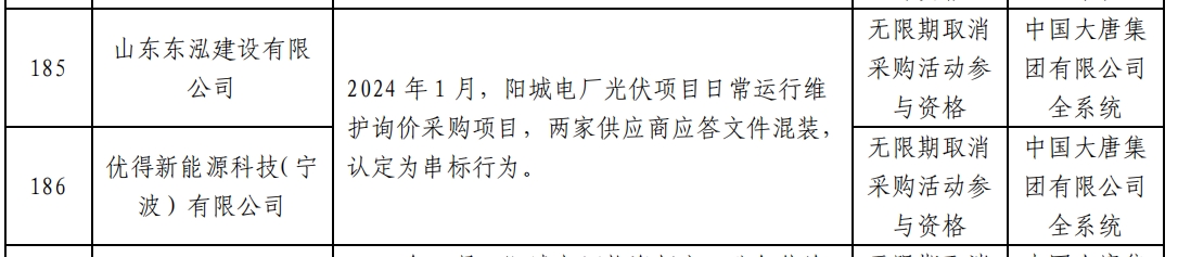 公告显示,2024 年 1 月,阳城电厂光伏项目日常运行维护询价采购项目,山东东泓建设有限公司与优得新能源科技(宁波)有限公司应答文件混装,被认定为串标行为。
