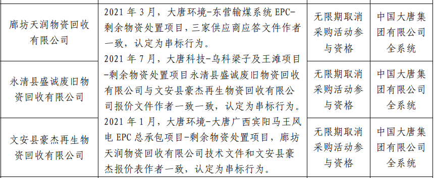 公告显示,2021 年 3 月,大唐环境-东营输煤系统EPC-剩余物资处置项目,三家供应商应答文件作者一致; 2021 年 7 月,大唐科技-乌科梁子及王滩项目 -剩余物资处置项目永清县盛诚废旧物资回收有限公司与文安县豪杰再生物资回收有限公司报价文件作者一致; 2021 年 1 月,大唐环境-大唐广西宾阳马王风电 EPC 总承包项目-剩余物资处置项目,廊坊天润物资回收有限公司技术文件和文安县豪杰报价表作者一致,以上均认定为串标行为。
