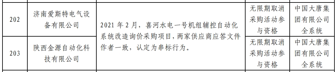 因上述行为,两家供应商被中国大唐集团有限公司全系统无限期取消采购活动参与资格。