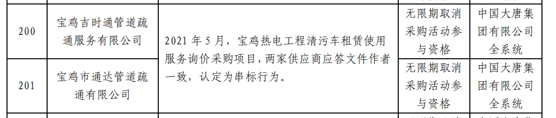 公告显示,2021年5月,在宝鸡热电工程清污车租赁使用服务询价采购项目中,宝鸡吉时通管道疏通服务有限公司与宝鸡市通达管道疏通有限公司因应答文件作者一致,被认定为串标行为。