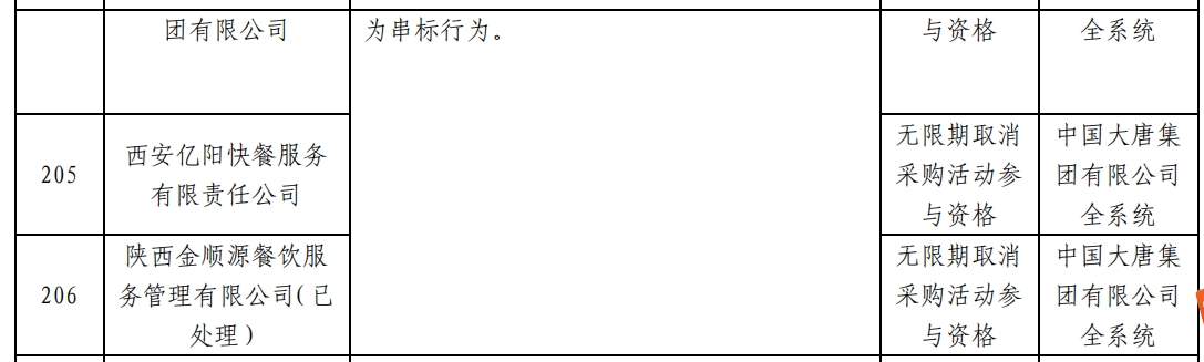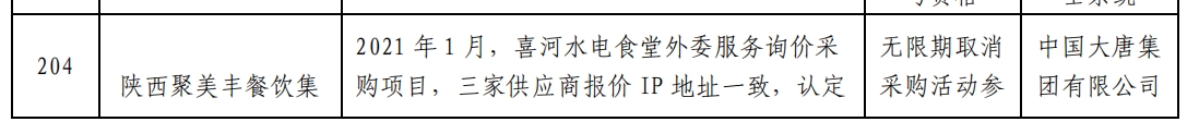 公告显示,2021 年 1 月,喜河水电食堂外委服务询价采购项目,陕西聚美丰餐饮集团有限公司、西安亿阳快餐服务有限责任公司 、陕西金顺源餐饮服务管理有限公司(已 处理)因报价 IP 地址一致,被认定为串标行为。