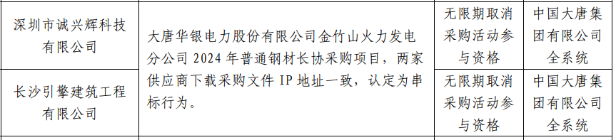 公告显示,大唐华银电力股份有限公司金竹山火力发电分公司2024年普通钢材长协采购项目中,深圳市诚兴辉科技有限公司与长沙引擎建筑工程有限公司两家供应商下载采购文件IP地址一致,认定为串标行为。