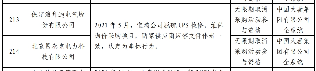 公告显示,2021 年 5 月,宝鸡公司脱硫 UPS 检修、维保询价采购项目,保定浪拜迪电气股份有限公司与北京易泰克电力科技有限公司因应答文件作者一致,被认定为串标行为。