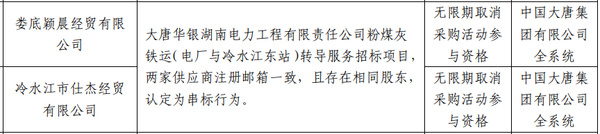 因上述行为,两家供应商被中国大唐集团有限公司全系统无限期取消采购活动参与资格。