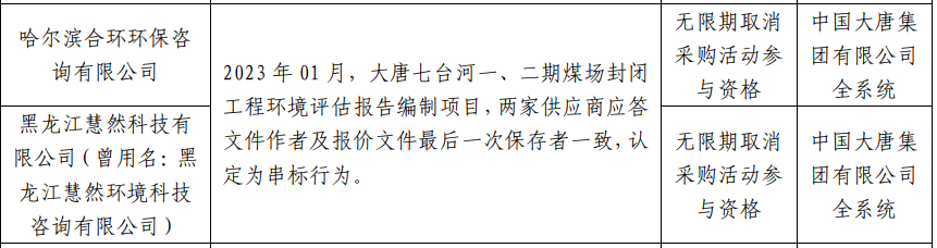 公告显示,2023年1月,大唐七台河一、二期煤场封闭工程环境评估报告编制项目中,哈尔滨合环环保咨询有限公司与黑龙江慧然科技有限公司(曾用名:黑龙江慧然环境科技咨询有限公司)两家供应商应答文件作者及报价文件最后一次保存者一致,认定为串标行为。