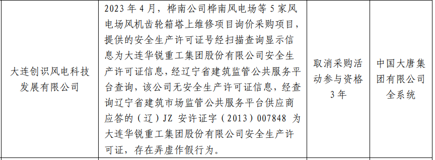 公告显示,2023 年 4 月,桦南公司桦南风电场等 5 家风 电场风机齿轮箱塔上维修项目询价采购项目,提供的安全生产许可证号经扫描查询显示信息为大连华锐重工集团股份有限公司安全生产许可证信息,经辽宁省建筑监管公共服务平 台查询,该公司无安全生产许可证信息,经查询辽宁省建筑市场监管公共服务平台供应商 应答的(辽)JZ 安许证字(2013)007848 为大连华锐重工集团股份有限公司安全生产许可证,存在弄虚作假行为。