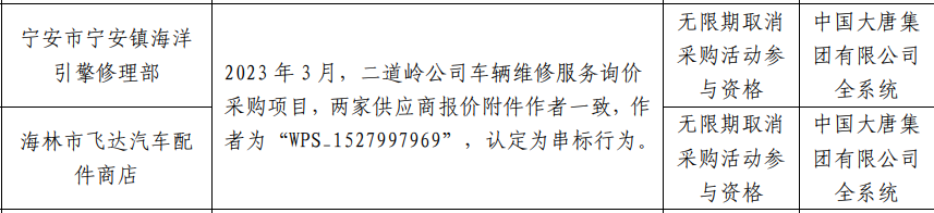 公告显示,2023年3月,二道岭公司车辆维修服务询价采购项目中,宁安市宁安镇海洋引擎修理部与海林市飞达汽车配件商店两家供应商报价附件作者一致,作者为“WPS_1527997969”,认定为串标行为。