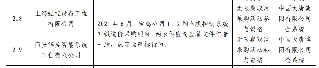 公告显示,2021年6月,宝鸡公司 1、2 翻车机控制系统 升级询价采购项目,上海强控设备工程有限公司以及西安华控智能系统工程有限公司应答文件作者一致,认定为串标行为。