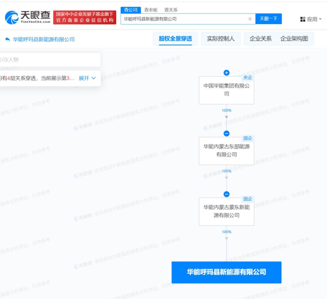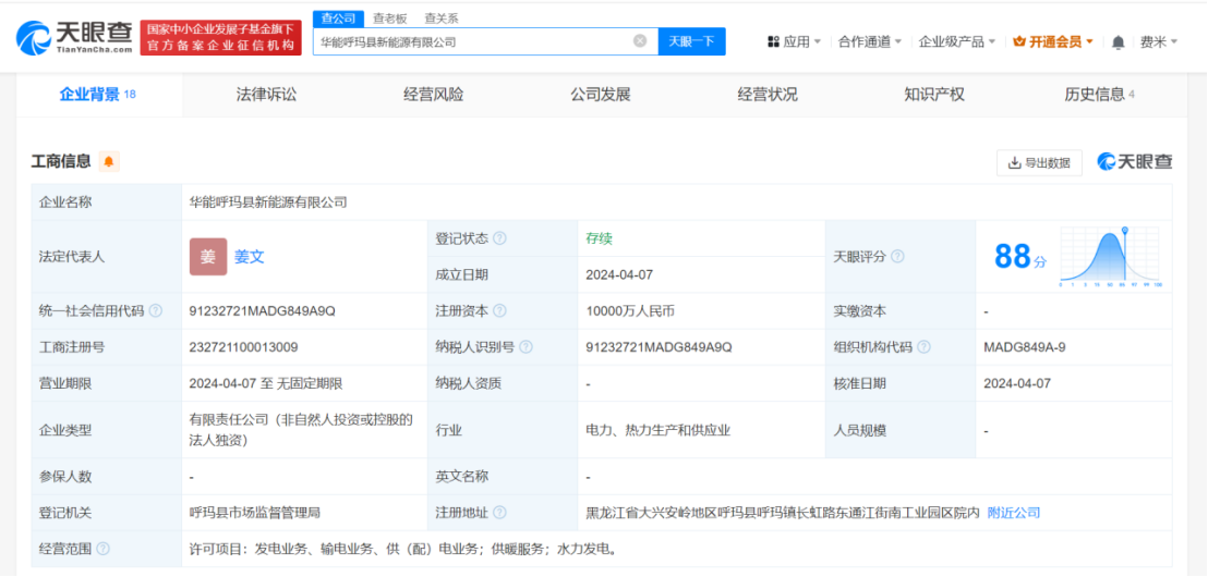 天眼查App显示,近日,华能呼玛县新能源有限公司成立,法定代表人为姜文,注册资本1亿人民币,经营范围为发电业务、输电业务、供(配)电业务,供暖服务,水力发电。股东信息显示,该公司由华能集团旗下华能内蒙古蒙东新能源有限公司全资持股。