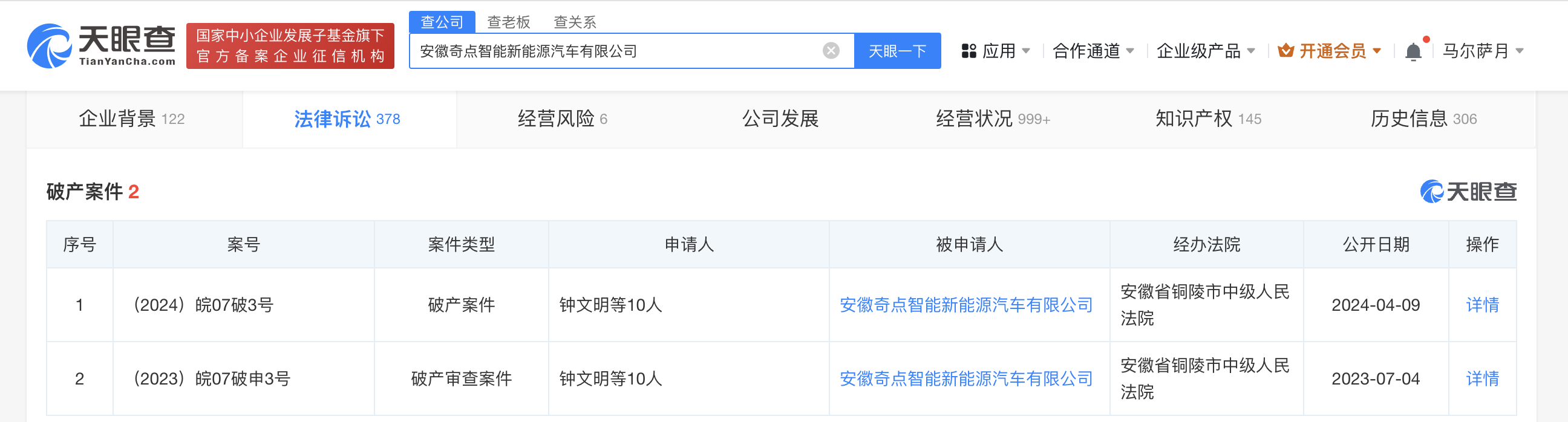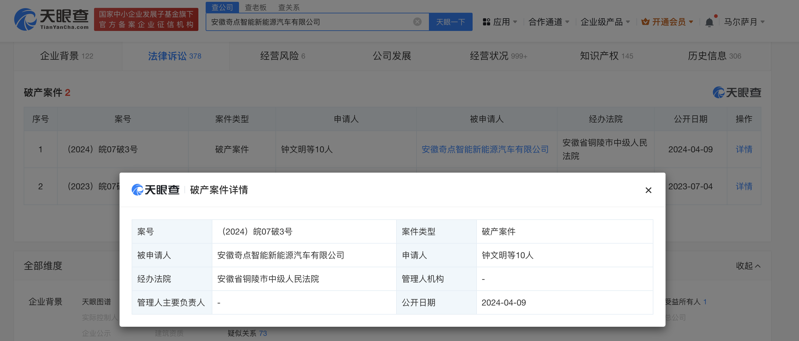 天眼查法律诉讼信息显示,4月9日,安徽奇点智能新能源汽车有限公司新增一则破产案件,申请人为钟文明等10人,经办法院为安徽省铜陵市中级人民法院。去年7月法院发布的公告显示,钟文明等10人向法院申请该公司破产清算,法院裁定受理此案。安徽奇点智能新能源汽车有限公司成立于2016年10月,法定代表人为徐军,注册资本13.5亿人民币。股东信息显示,该公司由奇点汽车关联公司智车优行科技(上海)有限公司、匠仁汽车科技(北京)有限公司共同持股。