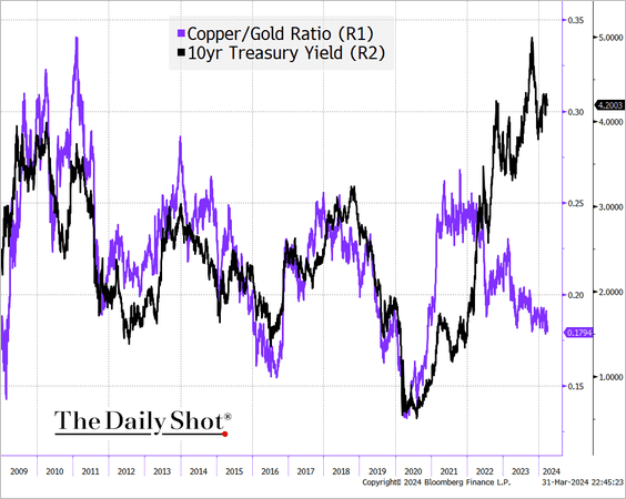 在不少资深宏观交易员的数据库里,往往会有一张铜/金比值与美债收益率间的对比图,两者长期以来通常是呈现正相关的。而如今,美债收益率的持续上涨,似乎也预示着铜相比于黄金,可能反而有着更多的上涨空间。