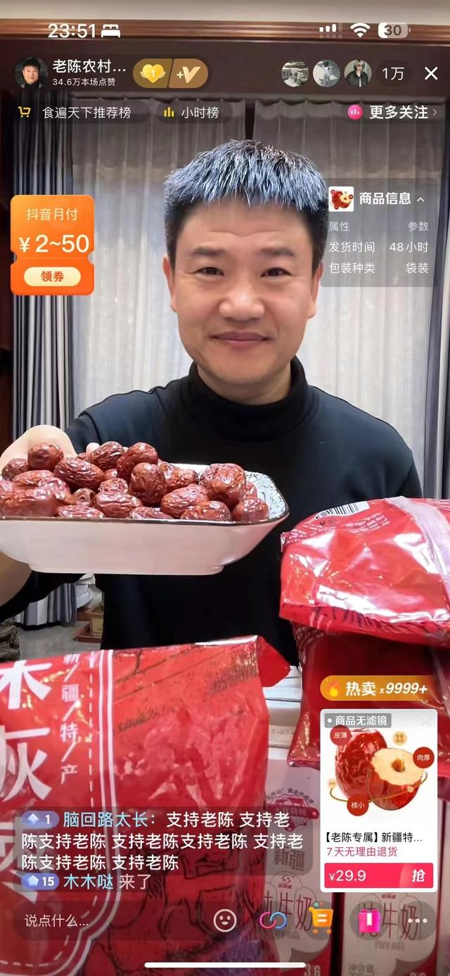 老陈首场带货直播,在线人数达2万人,一晚上的销售额达10万元。他对这个成绩很满意,“我没有团队,没有经验,这个成绩算是还不错的。”