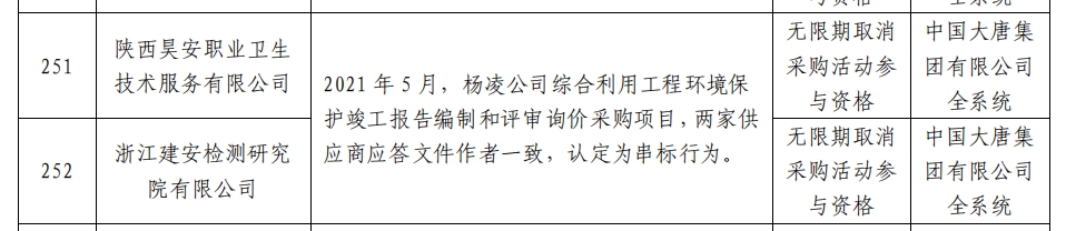 公告显示,在2021年5月的杨凌公司综合利用工程环境保护竣工报告编制和评审询价采购项目中,陕西昊安职业卫生技术服务有限公司与浙江建安检测研究院有限公司两家供应商应答文件作者一致,认定为串标行为。