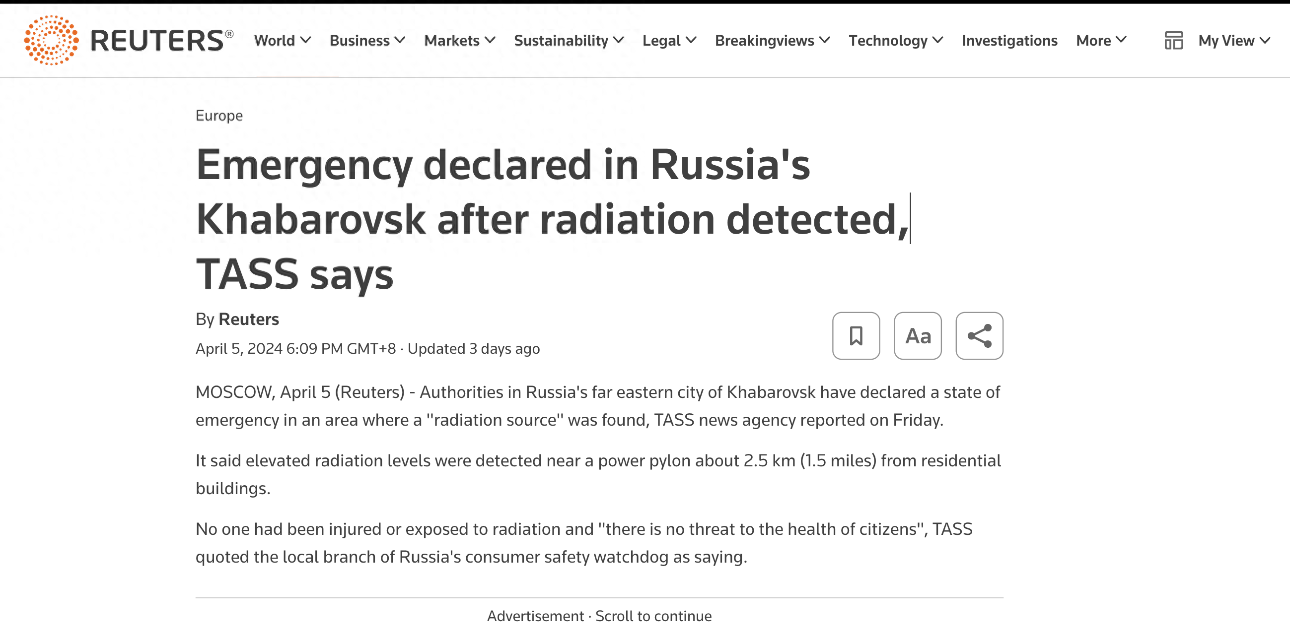 据路透社4月5日报道,俄罗斯远东城市哈巴罗夫斯克发现放射源,当局已宣布发现“辐射源”的地区进入紧急状态。报告称,在距住宅楼约2.5公里的输电塔附近检测到辐射水平升高。由于哈巴罗夫斯克紧邻中国黑龙江,其潜在的跨境影响引发国内部分居民的担忧。