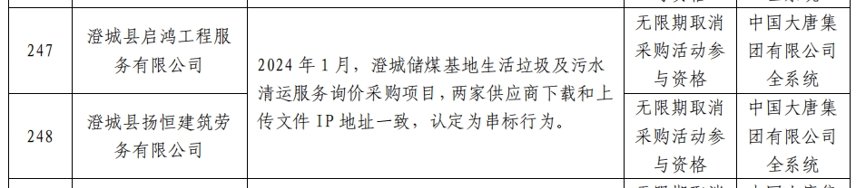 公告显示,在2024年1月的澄城储煤基地生活垃圾及污水清运服务询价采购项目中,澄城县启鸿工程服务有限公司与澄城县扬恒建筑劳务有限公司两家供应商下载和上传文件IP地址一致,认定为串标行为。