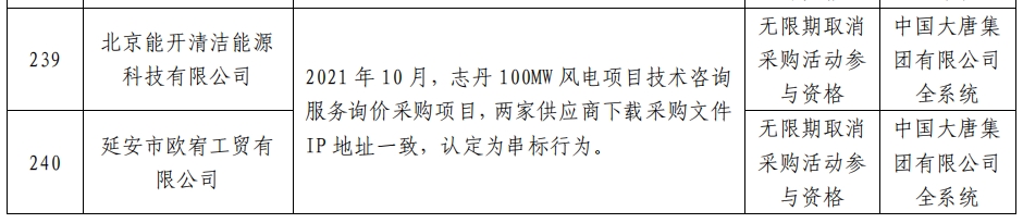 因上述行为,两家供应商被中国大唐集团有限公司全系统无限期取消采购活动参与资格。