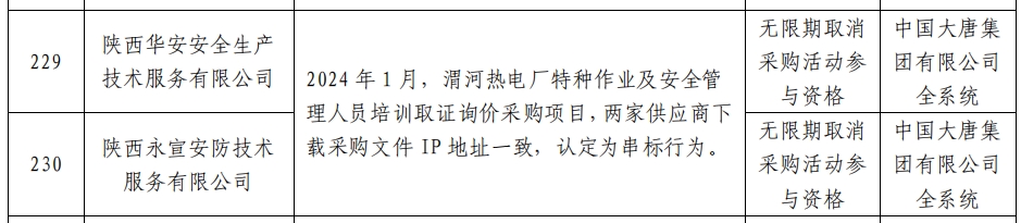 公告显示,在2024年1月的渭河热电厂特种作业及安全管理人员培训取证询价采购项目中,陕西华安安全生产技术服务有限公司与陕西永宣安防技术服务有限公司两家供应商下载采购文件IP地址一致,认定为串标行为。