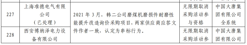 公告显示,在2021年3月的韩二公司磨煤机磨损件耐磨性能提升改造询价采购项目中,上海准德电气有限公司与西安博纳泽电力设备有限公司两家供应商应答文件作者一致,认定为串标行为。