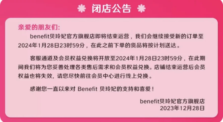 近日,高丝天猫旗舰店发出闭店公告,“即将于2024年4月19日结束运营,在此之前下单的货品,我们将按计划送达。店铺结束运营后会员权益也将失效,请您尽快前往会员中心进行线上兑换。”