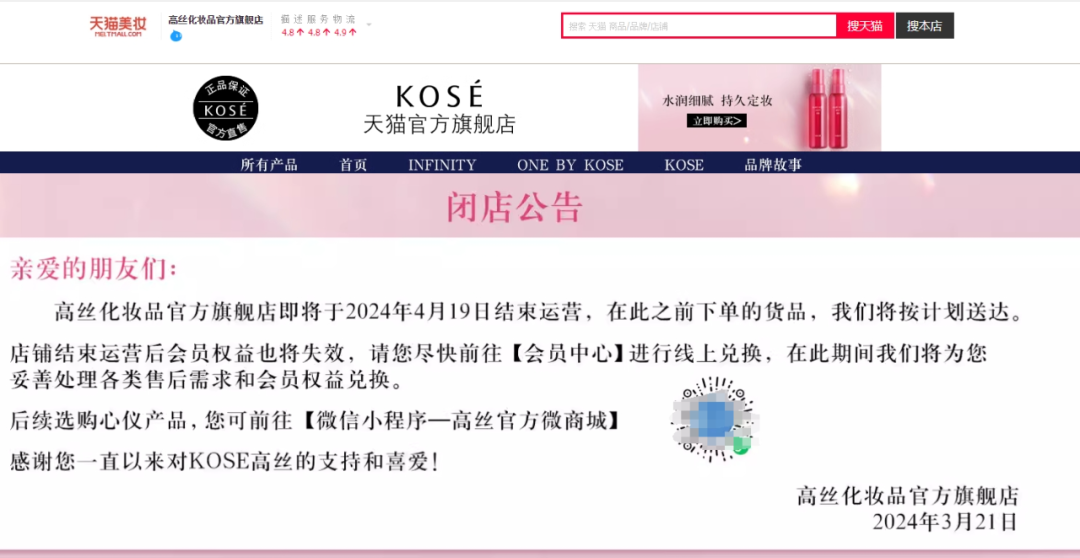 日本三大美妆公司之一的高丝,即将关闭天猫店铺。近日,天猫高丝化妆品官方旗舰店发布公告,将于2024年4月19日结束运营。