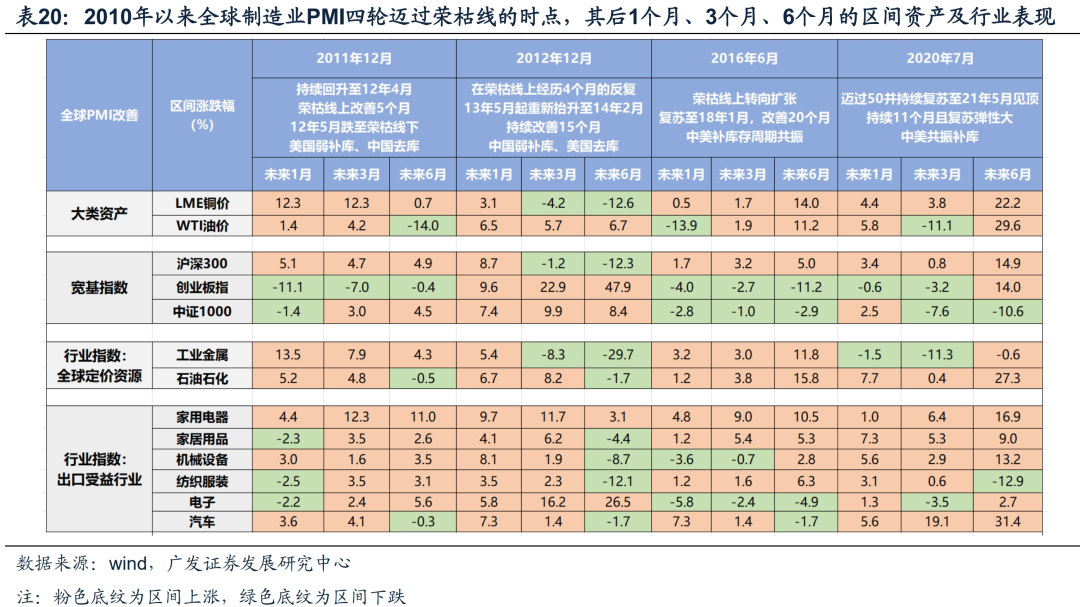 广发证券策略团队表示,今年1月以来,全球制造业PMI回到了50上方,若全球制造业PMI继续复苏,将对A股这些资产及行业产生影响:第一,全球制造业复苏,意味着部分全球定价的工业品供需格局改善,铜、油上涨概率较高,A股上游资源行业受益(工业金属/石油石化);第二,全球制造业PMI改善意味着中国出口链制造业的需求复苏,从而观测到中观数据的订单及收入验证,带动出口链行业的股价表现。