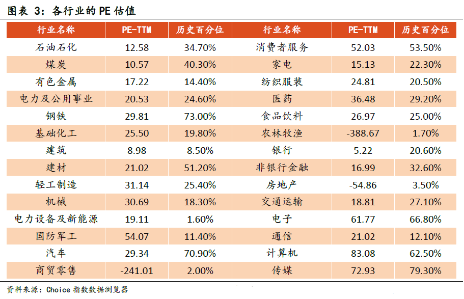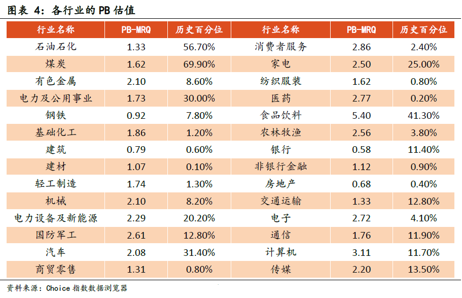 周期风格内部,行业估值各有分化。据Choice数据,当前PE估值在历史分位数20%以下水平的周期行业有:有色金属、基础化工、建筑、机械、国防军工、电力设备及新能源。当前PB估值在历史分位数20%以下水平的周期行业有:有色金属、钢铁、基础化工、建筑、建材、机械、国防军工、房地产、交通运输。