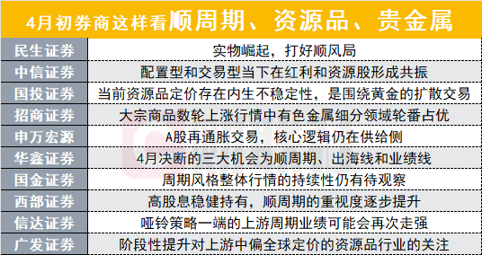 近几日,数家券商纷纷对于顺周期、资源品、贵金属等投资热点发表了新的观点。其中一些机构仍在观望4月上市公司业绩与经济数据带来的影响,一些机构认为实物资产开启回归之路。另一些机构则认为资源品短期性价比已开始降低。
