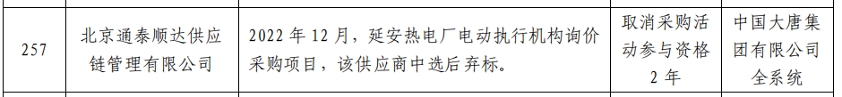 公告显示,2023年12月,延安热电厂电动执行机构询价采购项目,北京通泰顺达供应链管理有限公司中选后弃标。