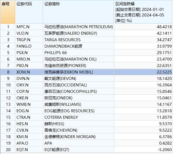 作为仅次于沙特阿美的全球第二大石油股、标普500能源板块最大成分股,埃克森美孚于4月5日盘中创下122.14美元/股的历史新高。今年以来,埃克森美孚股价已累计上涨超过22%,这样的区间涨幅即使与美股所谓的“七巨头”相比也毫不逊色,仅次于英伟达和Meta。