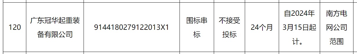 其中,广东冠华起重装备有限公司因被南方电网认定围标串标,处理措施为不接受投标,处理期限为自2024年3月15日起计24个月。