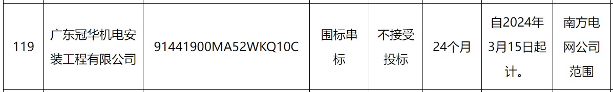 其中,广东冠华机电安装工程有限公司因被南方电网认定围标串标,处理措施为不接受投标,处理期限为自2024年3月15日起计24个月。