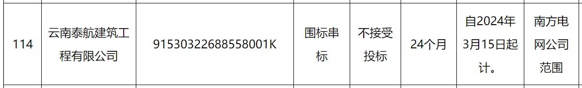 其中,云南泰航建筑工程有限公司因被南方电网认定围标串标,处理措施为不接受投标,处理期限为自2024年3月15日起计24个月。