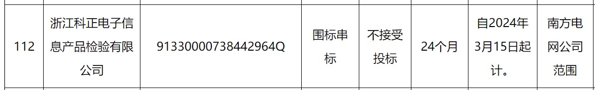 其中,浙江科正电子信息产品检验有限公司因被南方电网认定围标串标,处理措施为不接受投标,处理期限为自2024年3月15日起计24个月。