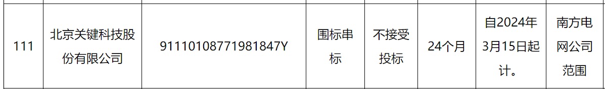 其中,北京关键科技股份有限公司因被南方电网认定围标串标,处理措施为不接受投标,处理期限为自2024年3月15日起计24个月。