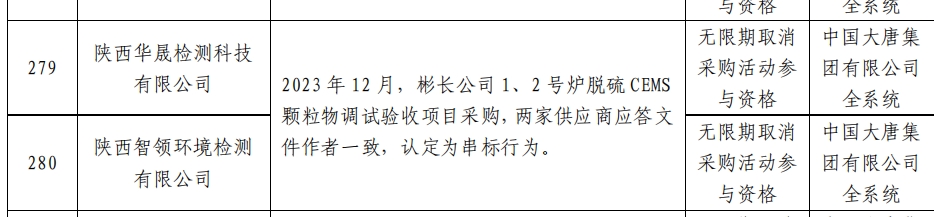 因上述行为,两家供应商被中国大唐集团有限公司全系统无限期取消采购活动参与资格。