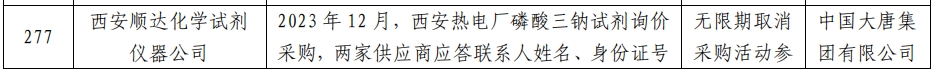 公告显示,2023年12月,西安热电厂磷酸三钠试剂询价采购,西安顺达化学试剂仪器公司与陕西振威化工物资有限公司应答联系人姓名、身份证号、报价IP地址均一致,认定为串标行为。