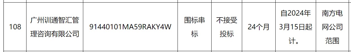 其中,广州训通智汇管理咨询有限公司因被南方电网认定围标串标,处理措施为不接受投标,处理期限为自2024年3月15日起计24个月。