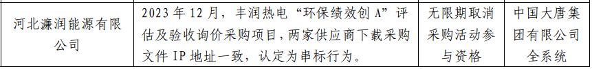 公告显示,2023年12月,丰润热电“环保绩效创A”评估及验收询价采购项目中,河北濂润能源有限公司与河北致远环保科技有限公司两家供应商下载采购文件IP地址一致,认定为串标行为。