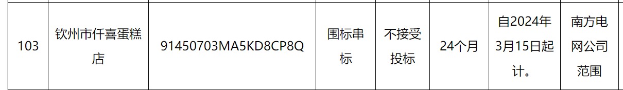 其中,钦州市仟喜蛋糕店因被南方电网认定围标串标,处理措施为不接受投标,处理期限为自2024年3月15日起计24个月。
