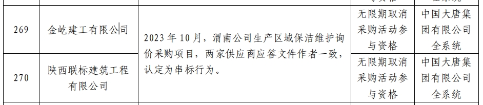 公告显示,2023年10月,渭南公司生产区域保洁维护询价采购项目,金屹建工有限公司与陕西联标建筑工程有限公司应答文件作者一致,认定为串标行为。