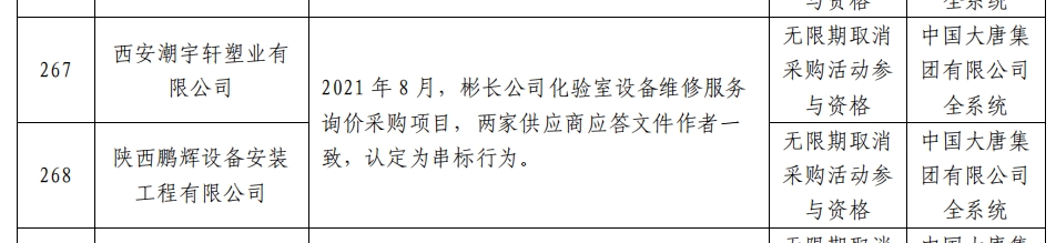 因上述行为,两家供应商被中国大唐集团有限公司全系统无限期取消采购活动参与资格。