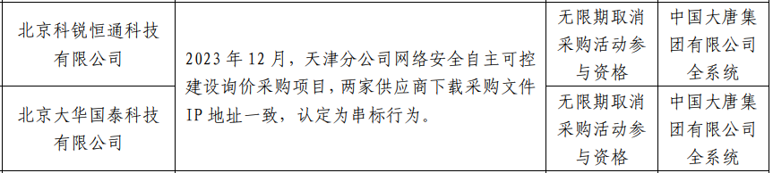 公告显示,2023年12月,天津分公司网络安全自主可控建设询价采购项目,北京科锐恒通科技有限公司与北京大华国泰科技有限公司两家供应商下载采购文件IP地址一致,认定为串标行为。