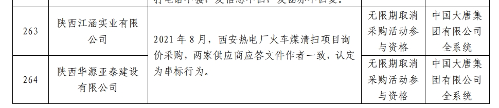 公告显示,2021年8月,西安热电厂火车煤清扫项目询价采购,陕西江涵实业有限公司与陕西华源亚泰建设工程有限公司应答文件作者一致,认定为串标行为。
